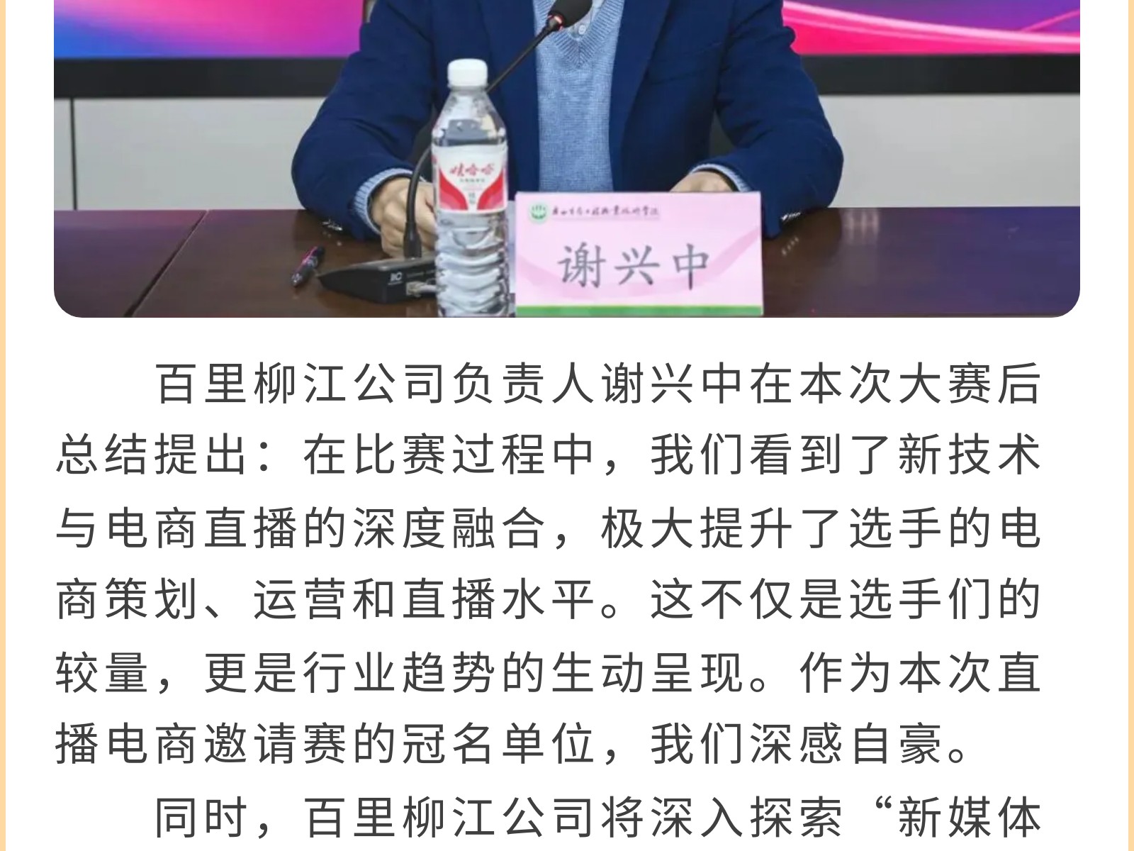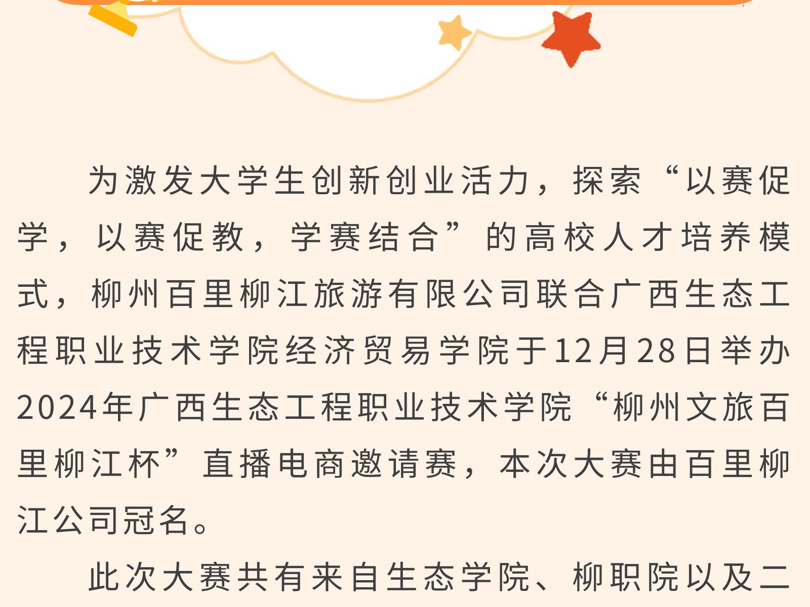高校聯(lián)合競(jìng)賽,共筑電商夢(mèng)想?——2024年廣西生態(tài)工程職業(yè)技術(shù)學(xué)院柳州文旅“百里柳江杯”直播電商邀請(qǐng)賽圓滿落幕 發(fā)布時(shí)間:2025年01月02日 18時(shí)來(lái)源:本站原創(chuàng)瀏覽:240 人次