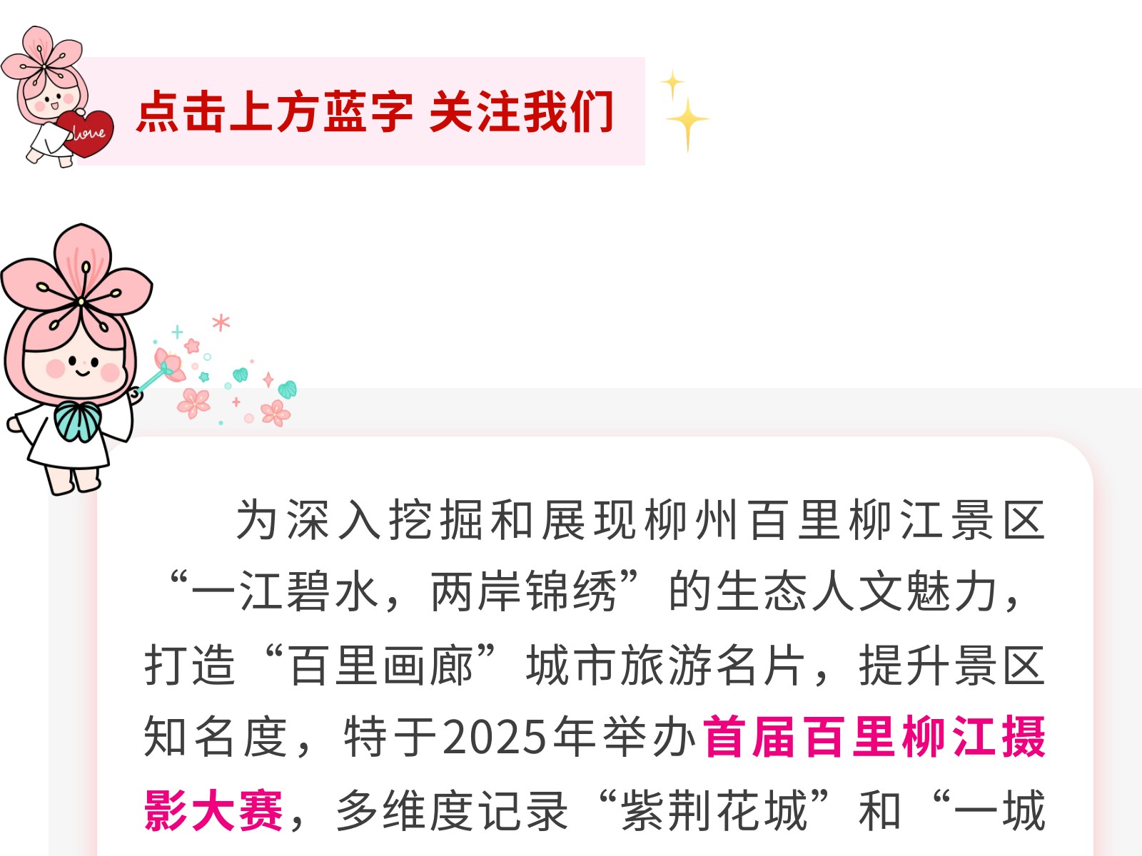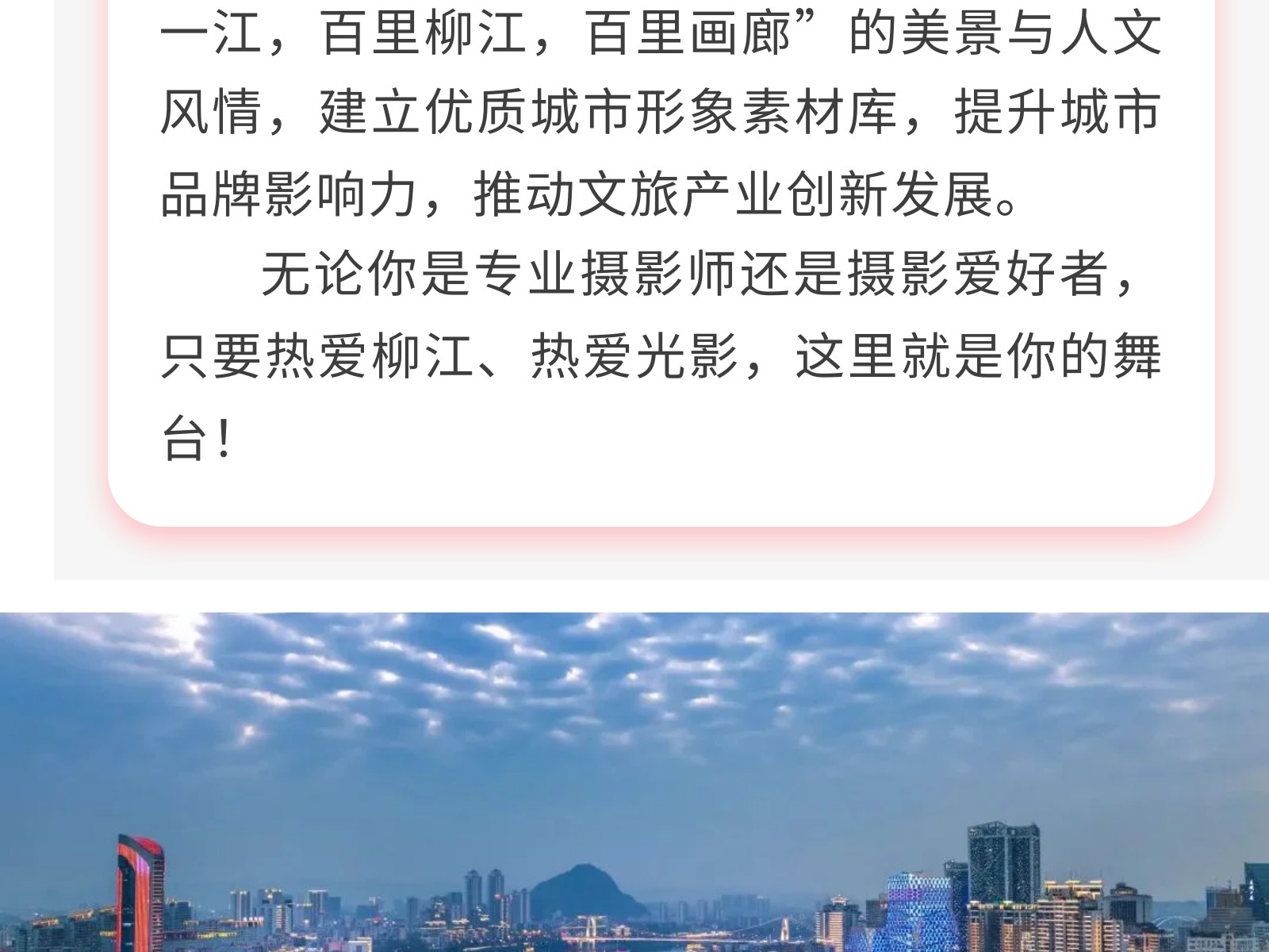 定格最美柳江!首屆“百里柳江”攝影大賽火熱征集中,邀你共賞百里畫廊! 發(fā)布時間:2025年04月26日 16時來源:本站原創(chuàng)瀏覽:115 人次
