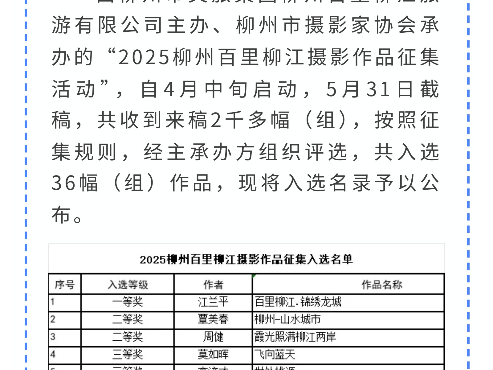 定格最美柳江!首屆“百里柳江”攝影大賽獲獎作品出爐! 發(fā)布時間:2025年07月16日 10時來源:本站原創(chuàng)瀏覽:64 人次